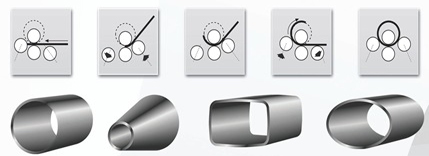 Гибка осуществляется при прокате заготовки между вальцами. Радиус и форма изгиба определятся взаимным расположением вальцов и расстоянием между ними. Параметры регулируются блоком, управляющим механизмом перемещения валов. Для исключения поломок при перегрузке предусмотрено блокировочное устройство, отключающее привод при недопустимой нагрузке.